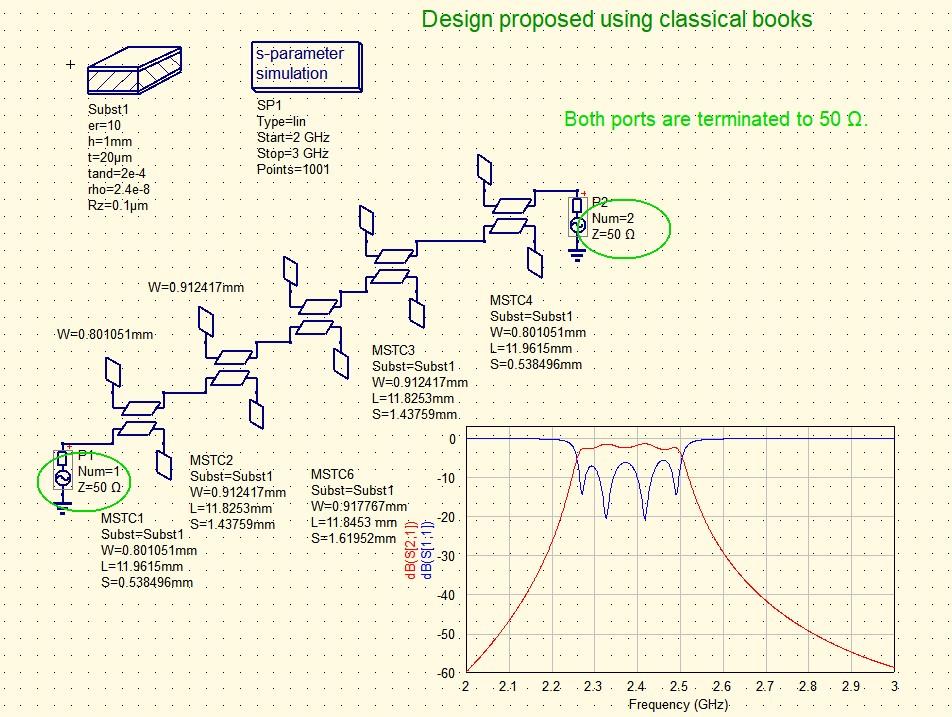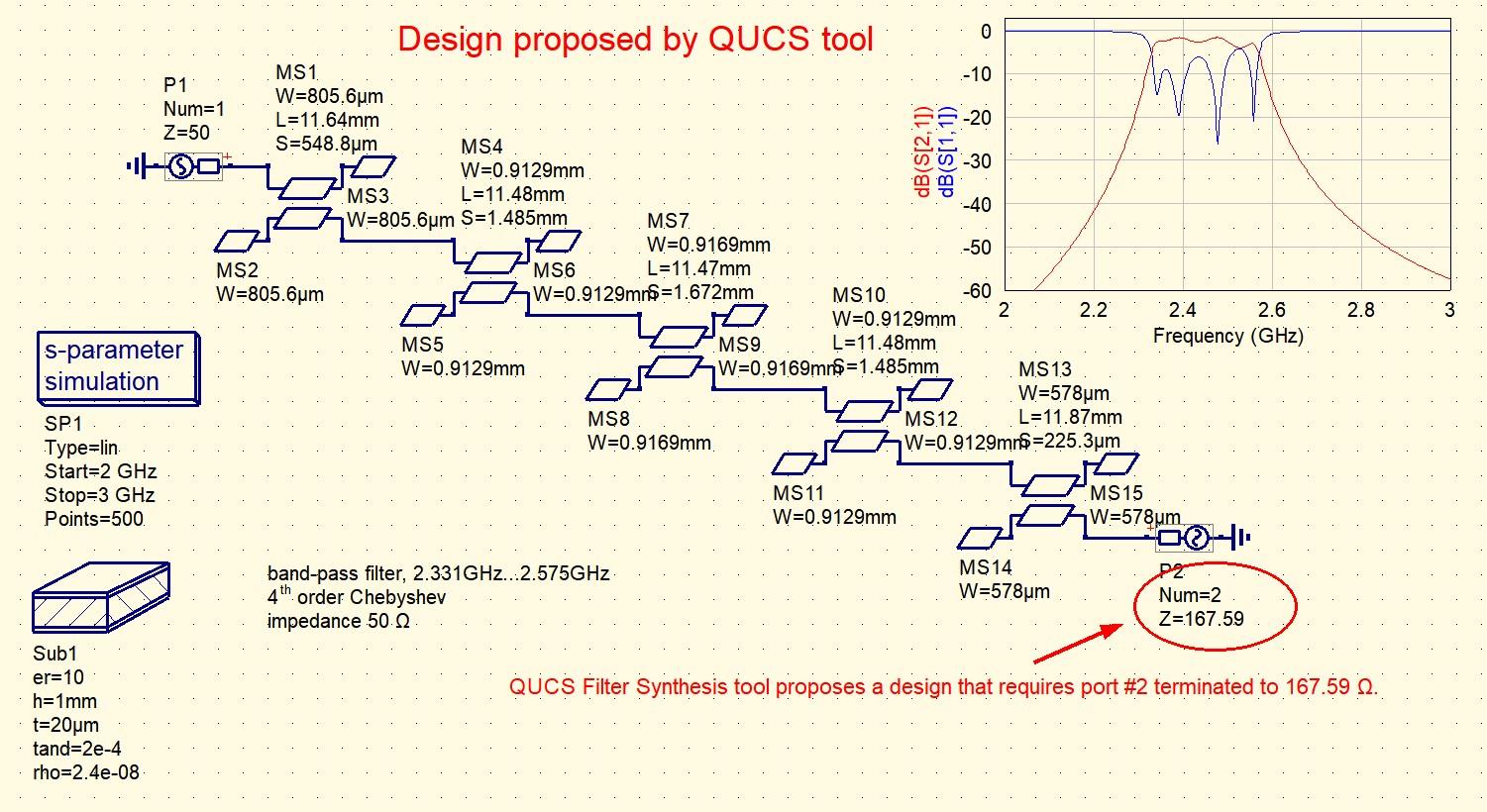 I noticed that the Filter Synthesis tool of uSimmics 5.8 designs a coupled-microstrip filter with Chebyshev response and even order that requires a load impedance different from the source impedance.  Why? In any microwave filter book you can find the recipe for a filter that, even in the case of an even-order Chebyshev, is always symmetric. Look at the following screenshots or run the package you can find attached.
